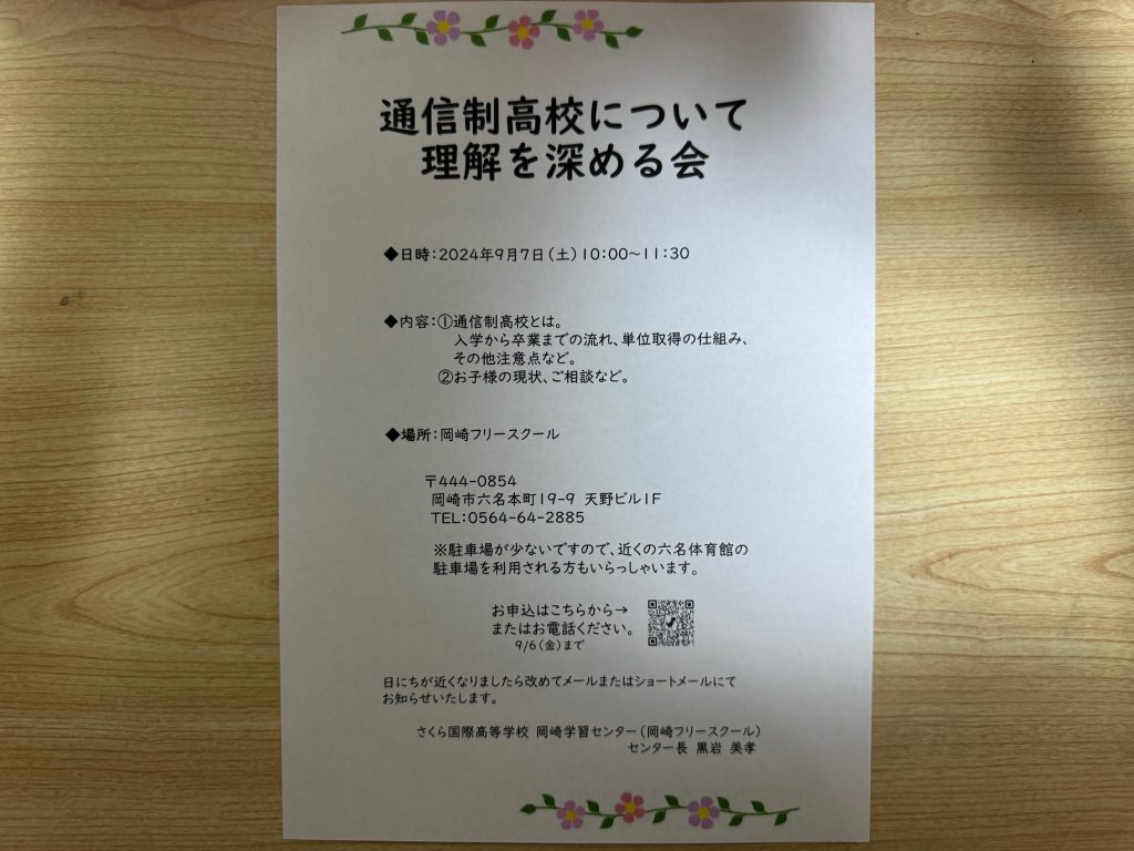 さくら国際高校岡崎学習センター(岡崎フリースクール)です。8/18(日)岡崎市のりぶらにて開催されたNPO法人コネクトスポットさん主催の通信制高校の合同説明会に、ブースを設けて参加させていただきました。会場にはたくさんの保護者さまやお子さまがみえて、資料を手に取り、お話を聞きに来てくださいました。